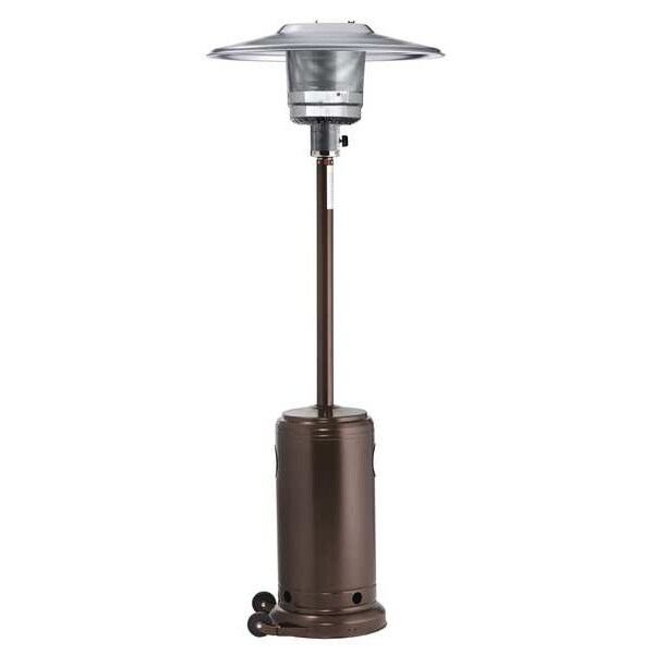 Portable Gas Patio Heater, Fuel Type Propane, Heating Capacity Input 45,000 BtuH, Heat Pattern 6 to 10 ft, Heating Area 113 sq ft, 314 sq ft, Housing Color Bronze, Ignition Type Electrical Spark, Minimum Cylinder Size 20 lb, Overall Height 90 in, Overall Width 18 1/4 in, Overall Depth 35 1/2 in, Patio Heater Style Canopy, Safety Features Anti-Tilt Wheelbase with Safety Cut Off Switch, Compatible with Product Type 20 or 30lb LP Tank, Air Temperature Rise 19 Degrees F