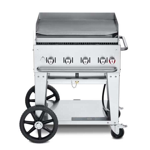 Portable Gas Griddle, Heat Source Propane, Overall Height 43 1/4 in, Overall Depth 28 in, Overall Length 38 in, Number of Burners 4, Cooking Surface Depth 21 in, Cooking Surface Width 28 in, Heating Capacity 64,500 BtuH, Tank Capacity 20 lb Tank, Material Stainless Steel, Mount Type Portable, Includes Grease Tray, Splash Guards, Water Pans, Weight 195 lb