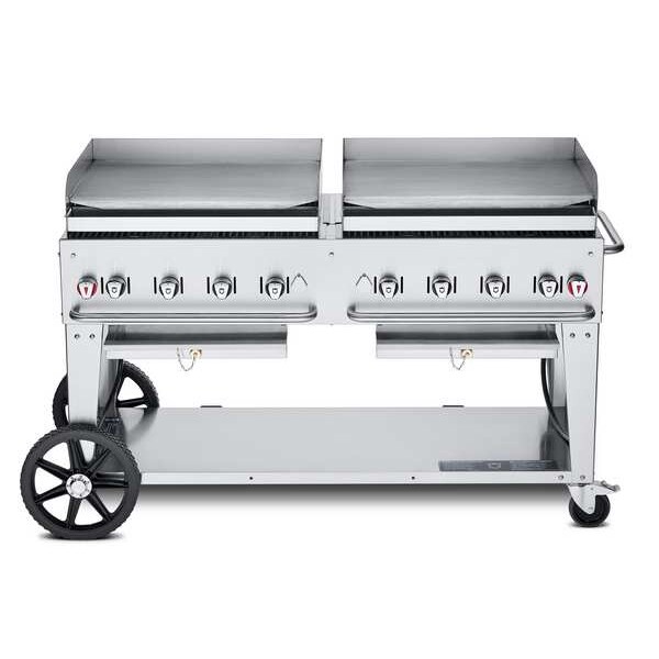 Portable Gas Griddle, Heat Source Propane, Overall Height 43 1/4 in, Overall Depth 28 in, Overall Length 69 in, Number of Burners 8, Cooking Surface Depth 21 in, Cooking Surface Width 58 in, Heating Capacity 129,000 BtuH, Tank Capacity 20 lb Tank, Material Stainless Steel, Mount Type Portable, Includes Splash Guards, Water Pans, Weight 348 lb