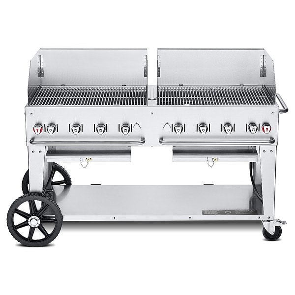 Propane Grill, Heat Source Propane, Overall Height 36 in, Overall Diameter Not Applicable, Overall Depth 28 in, Overall Length 69 in, Number of Burners 8, Cooking Surface Depth 21 in, Cooking Surface Width 58 in, Heating Capacity 129,000 BtuH, Tank Capacity One 20 lb Tank, Material Stainless Steel, Caster Type (2) Locking Casters, Includes Water Pans with Drain Ports, Weight 215 lb, Wheel Size 14 in