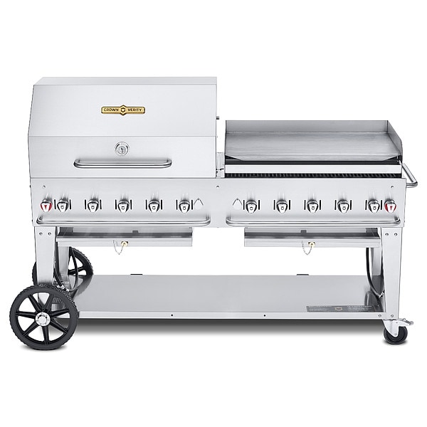 Propane Grill, Heat Source Propane, Overall Height 36 in, Overall Diameter Not Applicable, Overall Depth 28 in, Overall Length 81 in, Number of Burners 10, Cooking Surface Depth 21 in, Cooking Surface Width 70 in, Heating Capacity 159,000 BtuH, Tank Capacity One 20 lb Tank, Material Stainless Steel, Caster Type (2) Locking Casters, Includes 30 in Roll Dome, Bun Rack, Griddle, Weight 253 lb, Wheel Size 14 in