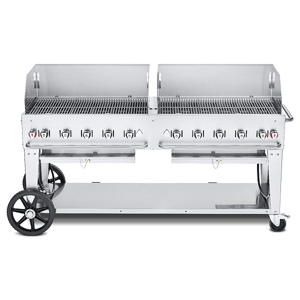 Propane Grill, Heat Source Propane, Overall Height 36 in, Overall Diameter Not Applicable, Overall Depth 28 in, Overall Length 81 in, Number of Burners 10, Cooking Surface Depth 21 in, Cooking Surface Width 70 in, Heating Capacity 159,000 BtuH, Tank Capacity One 20 lb Tank, Material Stainless Steel, Caster Type (2) Locking Casters, Includes Water Pans with Drain Ports, Weight 253 lb, Wheel Size 14 in
