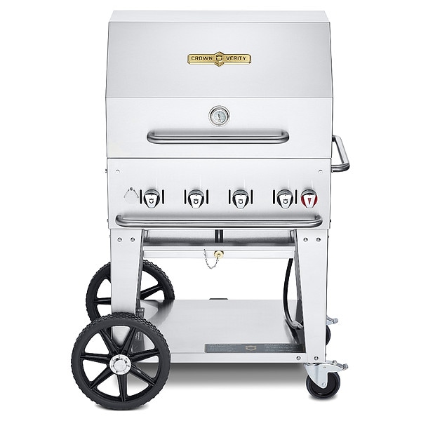 Propane Grill, Heat Source Propane, Overall Height 37 in, Overall Diameter Not Applicable, Overall Depth 27 in, Overall Length 39 in, Number of Burners 4, Cooking Surface Depth 21 in, Cooking Surface Width 28 in, Heating Capacity 64,500 BtuH, Tank Capacity One 20 lb Tank, Material Stainless Steel, Caster Type (2) Locking Casters, Includes Water Pans with Drain Ports, Weight 168 lb, Wheel Size 14 in