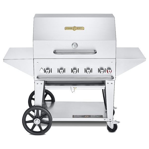 Propane Grill, Heat Source Propane, Overall Height 36 in, Overall Diameter Not Applicable, Overall Depth 28 in, Overall Length 44 in, Number of Burners 5, Cooking Surface Depth 21 in, Cooking Surface Width 34 in, Heating Capacity 79,500 BtuH, Tank Capacity One 20 lb Tank, Material Stainless Steel, Caster Type (2) Locking Casters, Includes (2) Removeable End Shelves, 36 in BBQ Cover, Adjustable Bun Rack, Roll Dome, Weight 143 lb, Wheel Size 14 in
