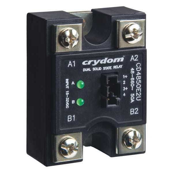 Dual Solid State Relay, Electrical Connection Screw Clamp, Heat Sink Not Included, Input Current 10 mA, Input Voltage 4 to 32V DC, Maximum Output Current with Heat Sink 50 A, Maximum Output Current without Heat Sink Not Recommended, Output Switching Mode Zero Crossing, Output Voltage Range 48 to 600V AC, Standards UL 508, Switch Component Type SCR, Current Type AC, Finger Safe No, Mounting Style Panel, Switch Configuration Form A, Voltage Type AC Output, Body Depth 0.8 in, Body Height 3.3 in