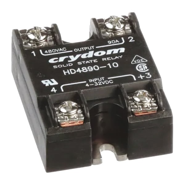 Solid State Relay, Electrical Connection Screw Clamp, Heat Sink Not Included, Input Current 12 mA, Input Voltage 4 to 32V DC, Maximum Output Current with Heat Sink 90 A, Maximum Output Current without Heat Sink Not Recommended, Output Switching Mode Random/Instantaneous, Output Voltage Range 48 to 530V AC, Standards CE Compliant to EN60950-1, CSA Certified, UL Listed, VDE Approved, Switch Component Type SCR, Current Type AC, Finger Safe No, Mounting Style Panel, Switch Configuration Form A