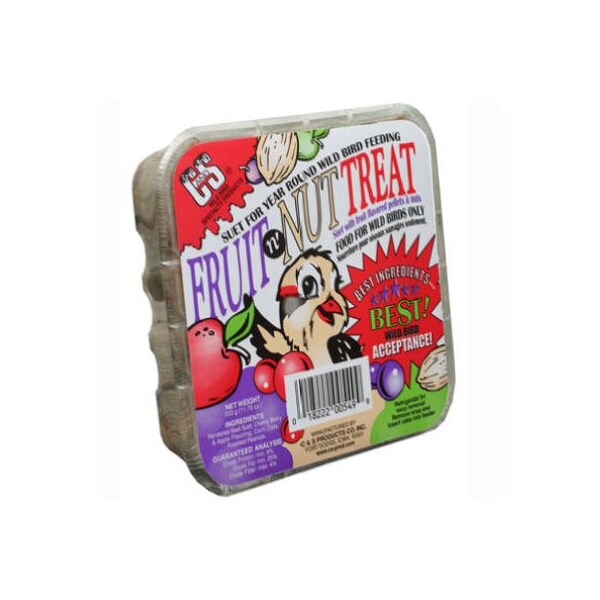11 OZ, Fruit 'N Nut Treat Suet Cake, Mixture Of Beef Suet, Roasted Peanuts, Oats, Corn, Milk, Apples, Blueberries, Cherries, Blue 1, Red 40, Yellow 5, Special Suet Attracts Fruit, Insect Eating Birds Year Round, Allergen Statement, Product May Contain 1 Or All Of The Following Allergens Milk, Tree Nuts, Fish, Shellfish