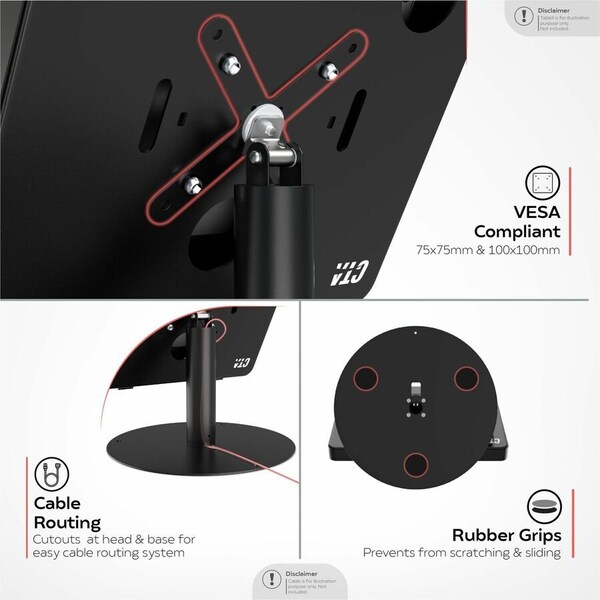 360 Degrees Enclosure Rotation for Landscape and Portrait Viewing, 360 Degrees Swivel at Base, Cable Routing Through Stand Neck, Heavy-Duty Locking Enclosure, Scratch Protected Base, Slip-Resistant Rubber Grips