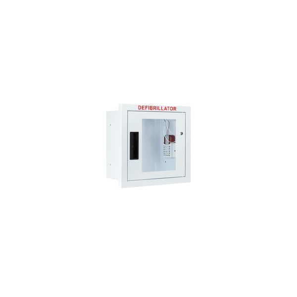 Fully Recessed small defibrillator wall cabinet with window, alarm, and strobe; Inside tub measures 11 1/2'' L x 11 1/8''H x 7''D; outside frame measures 13 1/2''L x 13''H x 1''D. Rough wall opening size: 12 1/2''L x 12 1/8''H x 6 1/4''D.