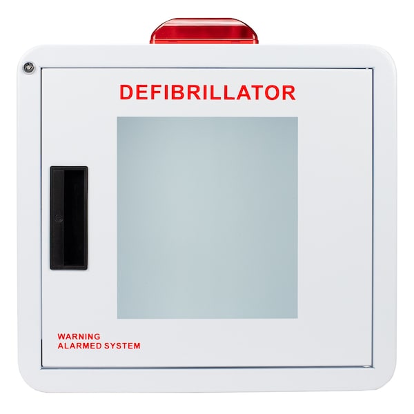 Premium large defibrillator wall cabinet with rounded corners, window, alarm and strobe; measures 16''L x 14 5/8''H x 8 3/8''W.