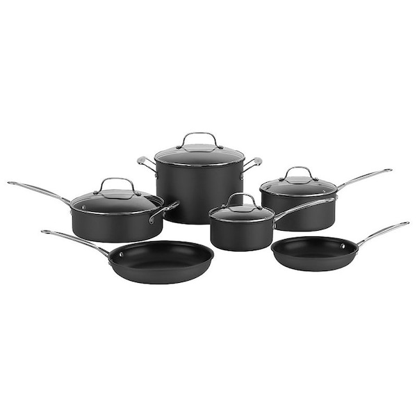 The Cuisinart Chef's Classic non-stick hard anodized 10-piece set includes all the tools you need to perform virtually any cooking task. Serious chefs can saute veal or salmon steaks, reduce a delicate sauce and simmer the ideal stock. You can also slow-cook creamy oatmeal, grill cheese sandwiches and warm up soup for lunch. The Chef's Classic non-stick hard anodized 10-piece set makes life easy and delicious, all day long.