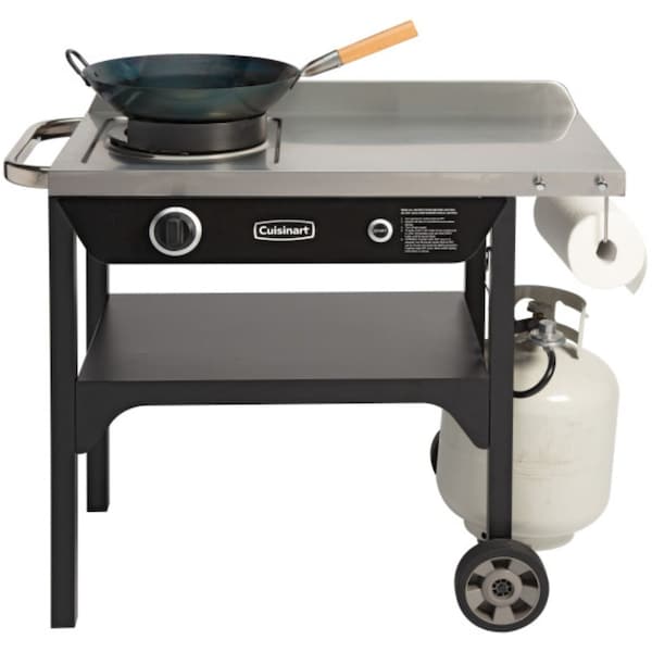 Introducing the ultimate outdoor cooking solution, our outdoor wok station. We provide the premium 14'' diameter hand-hammered carbon steel wok, complete with a contoured wooden handle for a comfortable grip that helps you to learn the Wok-Hei style. The durable carbon steel construction is perfect for deep seasoning, allowing a non-stick coating. Harness the power of our 50,000 BTU burner system, featuring a patent-pending design with electronic ''START'' ignition for effortless operation. With precision heat control, our custom valve allows for a low start point, gradually increasing to high gas flow for maximum power. Crafted for convenience, our cooking station boasts a spacious stainless steel top that withstands high-heat temperatures and is easy to clean. Plus, the lower storage shelf provides additional room to keep prepared ingredients or dishes close at hand. Elevate your outdoor cooking experience with our outdoor wok station.