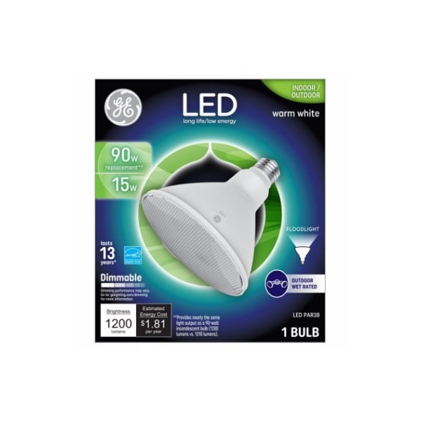 GE LED15DP38WW9QFL1 This is a 15 watt, plastic PAR38 with a medium base It is equivalent to a 90 watt incandescent The bulb provides 1200 lumens and has a color temperature 2700 Kelvins With a CRI 80, and an MOL 531 The bulb is dimmable, with a rated life of 15000 hours Energy Star Yes IndoorOutdoor flood, Outdoor wet rated Can be used in enclosed fixtures