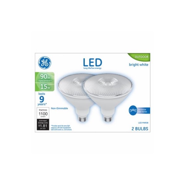 GE, 2 Pack, LED15P38WWFLB10K2, 15W, Bright White Light Color, Clear Bulb Color, PAR38 Shape, Flood LED Light Bulb, Equivalent To A 90W Incandescent, 25 Degree Beam, Medium Base, NonDimmable, Outdoor WetRated, 1100 Lumens, 3000 Kelvin Color Temperature, CRI 80, 9 Year, 10,000 Hours Rated Life, MOL 40, Boxed