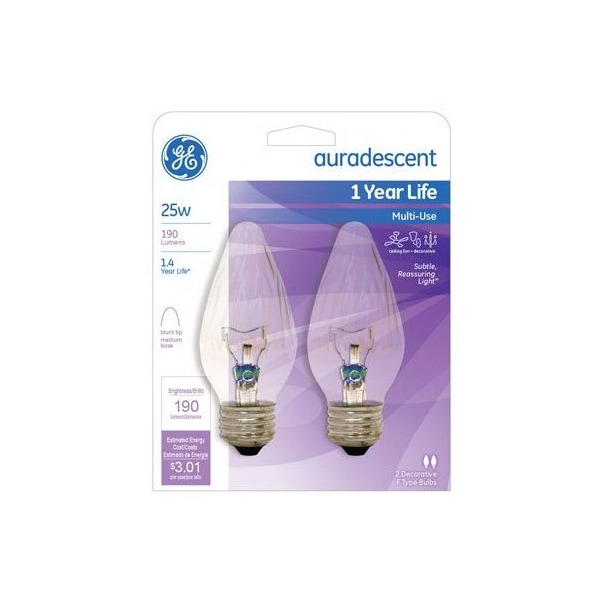 GE, 25FMAUCF2TP4, 2 Pack, 25W, Flame Shaped, Auradescent Bulb, Medium Base, MOL 412, Rated Life 1,500 Hours, Blunt Tip, Faceted