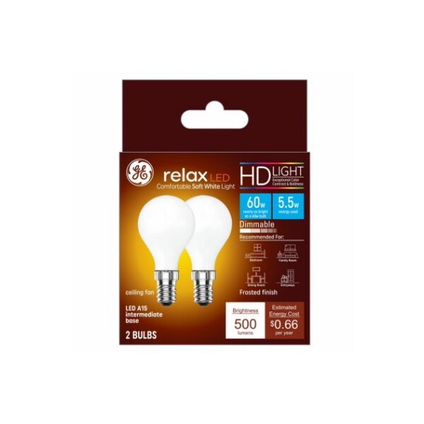 GE LED6DA15IGCSW9L2, 2 Pack, 55 watt, frosted glass A15 with an intermediate base It is equivalent to a 60 watt incandescent The bulb provides 500 lumens and has a color temperature 2700 Kelvins With a CRI 90 , and an MOL 35 The bulb is dimmable , with a rated life of 15000 hours The bulb is restricted in the following states CA
