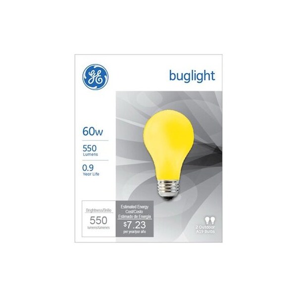 GE, 60AY, 2 Pack, 60W, Yellow Bug Light Bulb, ALine A19, Maximum Overall Length 4716, Medium Base, 550 Lumens, 1000 Hours
