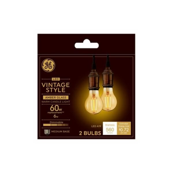 GE LEDFA19GV2KLT2, 2 Pack This is a 6 watt, glass A19 with a medium base It is equivalent to a 60 watt incandescent The bulb provides 560 lumens and has a color temperature 2000 Kelvins With a CRI 80, and an MOL 443 The bulb is dimmable, with a rated life of 15000 hours Vintage, amber glass, straight filament