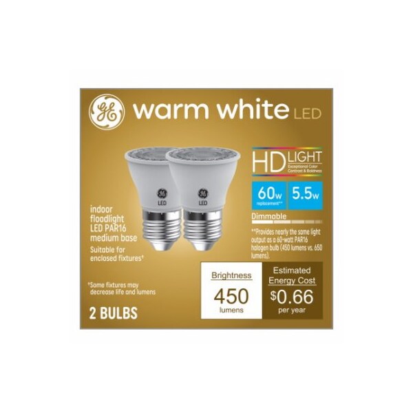 GE, 2 Pack, LED6DP169CWWLT2PK 6W, Warm White Light Color, Clear Bulb Color, Par16 Bulb Shape, LED Directional Bulb, Equivalent To A 65W Incandescent, 20 Degree Beam, Medium Base, Dimmable, 450 Lumens, 3000 Kelvin Color Temperature, CRI95, 137 Year, 15000 Hours Rated Life, MOL288, Carded Can be used in enclosed fixtures