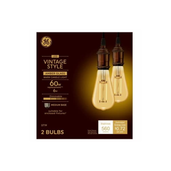 GE, 2 Pack, LED6DST1921GV2T, 6W, Warm White Light Color, Amber Bulb Color, ST19 Shape, Vintage LED Bulb, Equivalent To A 60W Incandescent, Medium Base, Straight Filament, Dimmable, 560 Lumens, 2,200 Kelvin Color Temperature, CRI80, 137 Year, 15,000 Hours Rated Life, MOL443, All Glass, Boxed