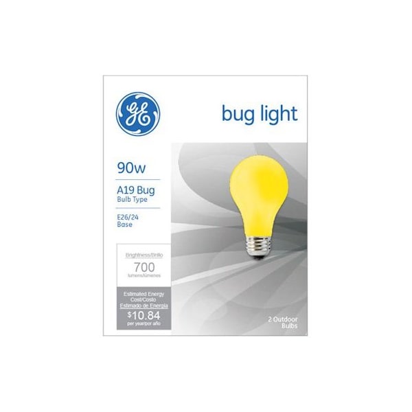 GE, 90AY, 2 Pack, 90W, Yellow Bug Light Bulb, ALine A19, Maximum Overall Length 4716, Medium Base, 1,000 Lumens, 1,000 Hours