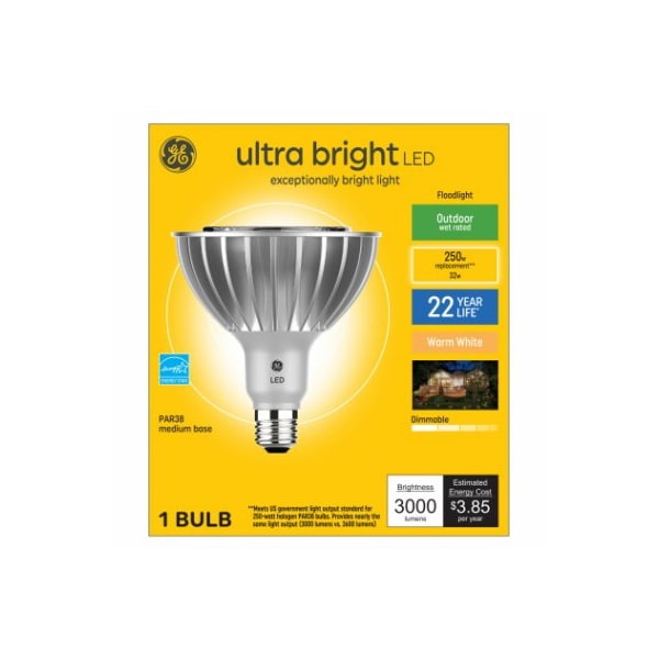 GE, LED32DP38FLLT, 32W, Warm White Light Color, Frosted Bulb Color, Par38 Shape, Outdoor LED Flood, 32W Replacement Or Equivalent To A 250W Incandescent, 30 Degree Beam, Medium Base, Dimmable, 3,000 Lumens, 2,700 Kelvin Color Temperature, CRI 80, 228 Year, 25,000 Hours Rated Life, MOL 562, Wet Rated, Energy Star Approved, Boxed
