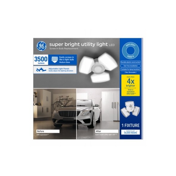 GE, UTLMB350850WTNUC1 35 watt equivalent to a 60 watt incandescent Super Bright complete fixture with adjustable light panels and a medium base Toolfree installation Color temperature is 5000K and lumen output is 3500 Fixture is nondimmable, suitable for damp locations, and has a rated life of 50000 hours CEC compliant