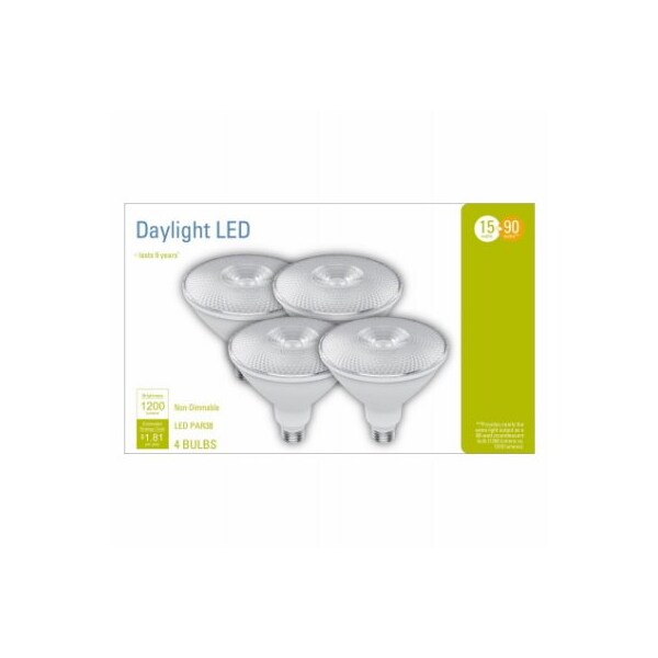 GE, 4 Pack, LED15P38DLFLBCB4 This is a 15 watt, PAR38 LED that's equivalent to a 90 watt incandescent The bulb has a medium base, 5000 Kelvin color temperature, is nondimmable with a CRI 80 The bulb is rated 1300 Lumens, and has a 10,000 hour rated life This is a boxed, 4 pack