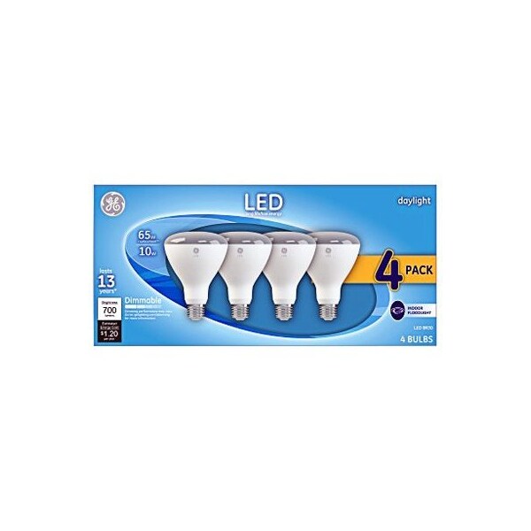 GE, 4 Pack, LED9DR30EG5KWT4, 9W, Daylight Light Color, Frosted Bulb Color, R30 Shape, Reflector LED, Equivalent To A 65W Incandescent, 40 Degree Beam, Medium Base, Dimmable, 650 Lumens, 5,000 Kelvin Color Temperature, CRI 80, 137 Year, 15,000 Hours Rated Life, MOL 537, Energy Star Approved, Boxed