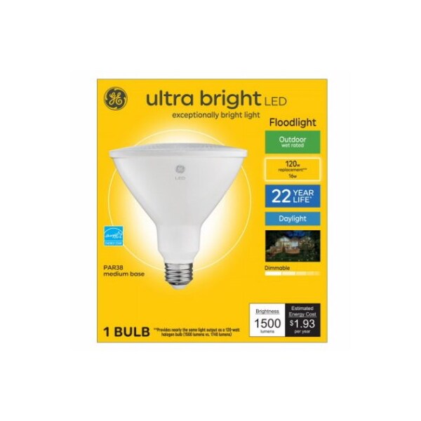GE LED16DP385W5K25KOT1 This is a 16 watt, plastic PAR38 with a medium base It is equivalent to a 120 watt halogen The bulb provides 1500 lumens and has a color temperature 5000 Kelvins With a CRI 80 , and an MOL 531 The bulb is dimmable, with a rated life of 25000 hours Energy Star CA Restricted GE Ultra Bright that is outdoor wetrated