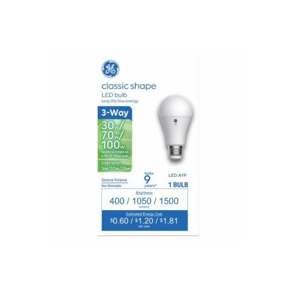 GE LED15TWA19MSW9PWQBOPP1 This is a 5w10w15w 3way plastic A19 with a medium base It is equivalent to a 3070100 watt incandescent The bulb provides 1500 lumens and has a color temperature 2700 Kelvins With a CRI 90 and an MOL 443 The bulb is nondimmable with a rated life of 10000 hours CA Title 20 Compliant