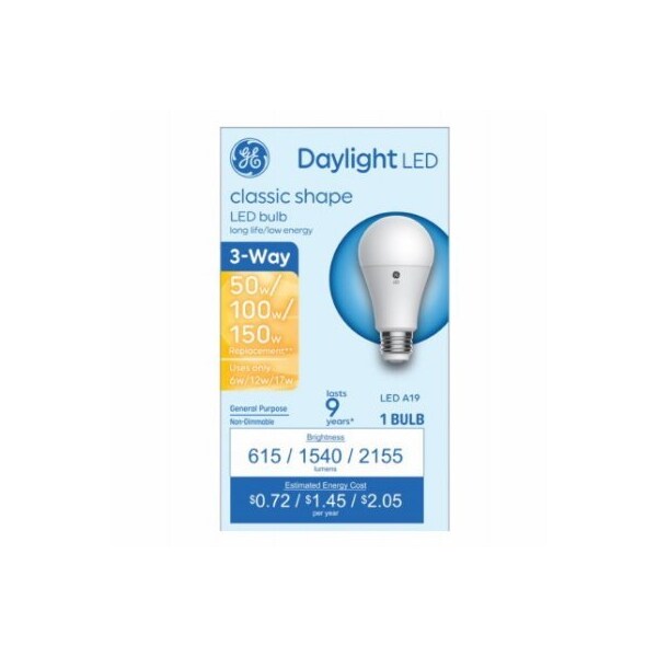GE LED17TWA19MDLPWBOPP1 This is a 6w12w17w 3way plastic A19 with a medium base It is equivalent to a 50100150 watt incandescent The bulb provides 2155 lumens and has a color temperature 5000 Kelvins With a CRI 80 and an MOL 443 The bulb is nondimmable with a rated life of 10000 hours