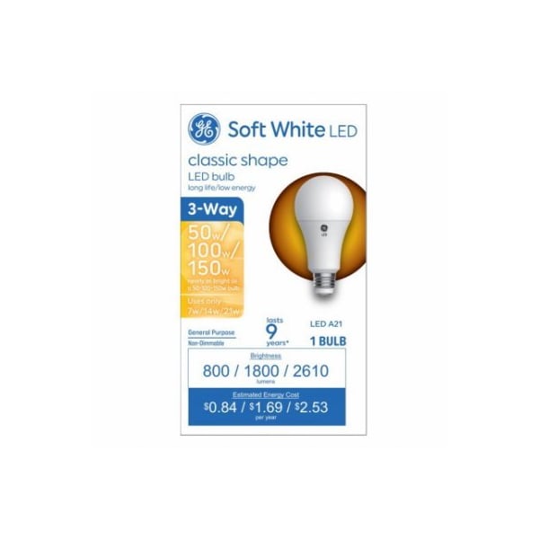 GE LED21TWA21MSWPWQBOPP1 This is a 7w14w21w 3way plastic A21 with a medium base It is equivalent to a 50100150 watt incandescent The bulb provides 2610 lumens and has a color temperature 2700 Kelvins With a CRI 90 and an MOL 476 The bulb is nondimmable with a rated life of 10000 hours CA Title 20 Compliant