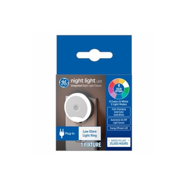GE LED05ADVARINSWFADOT This is a 05 watt circular bulb shape, plastic, with a plugin base The color temperature is 2700K with lumens 3 It has a CRI 80 and an MOL 270 It is nondimmable with a 25000 hour rated life It is CEC exempt Low glare light ring Automatic onoff light sensor Color changing with 9 color options 3 light modes Color changing, solid color, solid white
