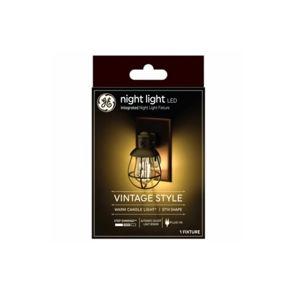 GE LED05VINTFHV2KDIMOT This is a 1 watt ST14 bulb shape, glass with a plugin base The color temperature is 2000K with lumens 35 It has a CRI 80 and an MOL 340 It features step dimmability with a 25000 hour rated life It is CEC exempt Vintage style with warm candle light Bulb is enclosed in a metal wire housing Automatic onoff light sensor Step dimming 10050off
