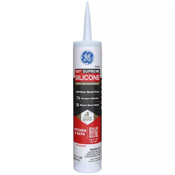 GE Supreme Silicone Kitchen and Bath sealant is a premium, 100% silicone and 100% waterproof sealant ideal for areas that are constantly exposed to moisture especially those in the kitchen and bathroom. Our sealant also has a 30-minute water-ready formula and resists stain-causing mold and mildew growth. This silicone sealant offers 100% more flexibility than Class 25 sealants and 7X stronger adhesion than our Silicone 1 sealant. Plus, GE Supreme Silicone Kitchen and Bath sealant offers 50% joint-movement capabilities without cracking or shrinking. Our sealant has a low odor that's ideal for interior applications, and it won't discolor most high-end metal finishes such as chrome, bronze, and nickel.