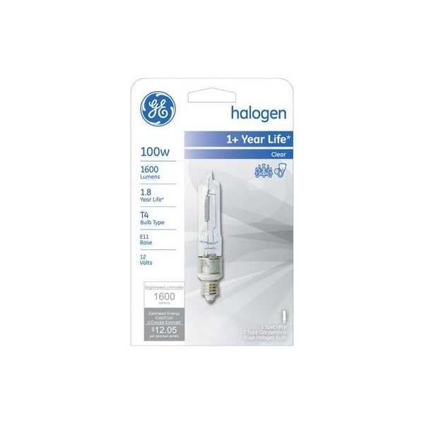 GE, Q100CLMCCD, 100W,120V, Quartz Halogen Lamp, T4 Bulb Shape, Mini Candelabra Base, MOL 281, 2,000 Hours Life, 1,600 Lumens, 2,950 Degrees Kelvin Color Temperature, Carded
