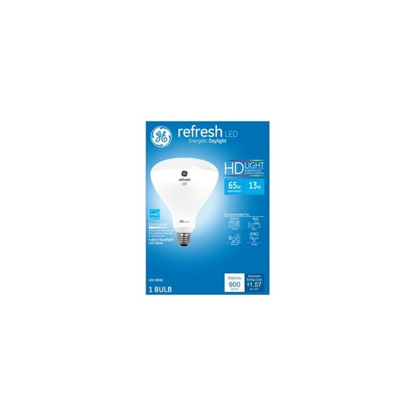 GE, LED13DBR40EC9DL1, 13W, Daylight Light Color, White Bulb Color, BR40 Shape, Refresh HD LED Light Bulb, Equivalent To An 85W Incandescent, Medium Base, Dimmable, 900 Lumens, 5,000 Kelvin Color Temperature, CRI 80, 137 Year, 15,000 Hours Rated Life, MOL 54, Energy Star Approved, Boxed Can be used in enclosed fixtures