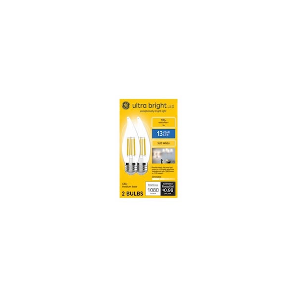 GE LED8DCAM/SW9GCUQ-OT2. 2 Pack. This is an 8 watt, glass candle shaped bulb with a medium base. It is equivalent to a 100 watt incandescent. The bulb provides 1080 lumens and has a color temperature: 2700 Kelvins. With a CRI: 90, and an MOL: 4.20 in. The bulb is dimmable, with a rated life of 15000 hours. Item Notes: Outdoor wet rated.