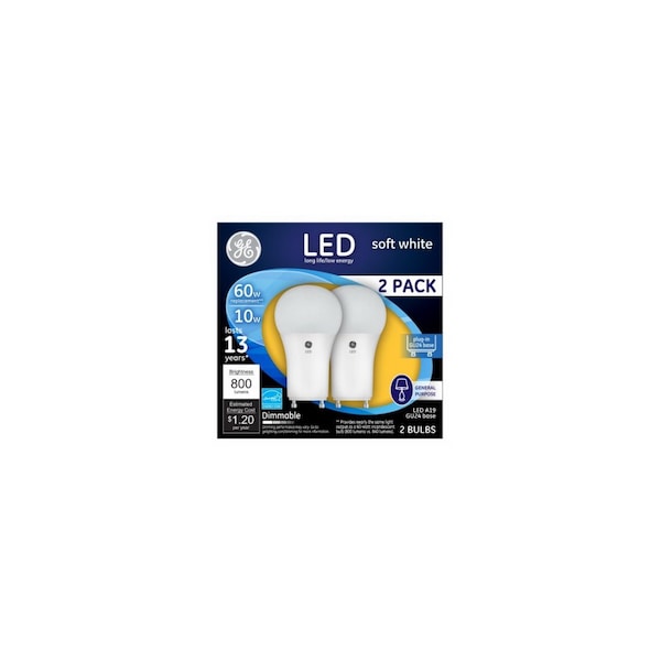 GE, 2 Pack, LED10DA19GU24-2, 10W, Soft White Light Color, White Bulb Color, A19 Shape, LED General Purpose, Equivalent To A 60W Incandescent, GU24 Base, Dimmable, 800 Lumens, 2,700 Kelvin Color Temperature, CRI=80, 13 Year, 15,000 Hours Rated Life, MOL=4.13 in, Energy Star Approved, Boxed.