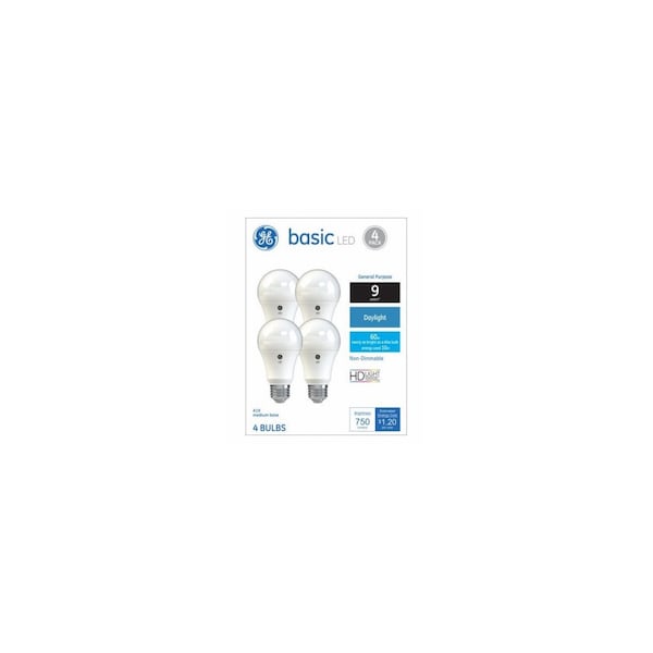 GE, 4 Pack, LED10ADL9CP-4P, 10W, Daylight Light Color, White Bulb Color, A19 Shape, Basic LED Bulb, Equivalent To A 60W Incandescent, Medium Base, Non-Dimmable, 750 Lumens, 5,000 Kelvin Color Temperature, 90, 9 Year, 10,000 Hours Rated Life, MOL=4.43in, California Title 20, Boxed.
