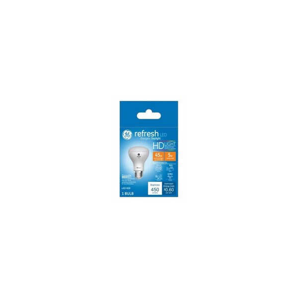 GE, LED5DR209CDL, 5W, Daylight Light Color, White Bulb Color, R20 Shape, Refresh High Definition, Directional LED Bulb, Equivalent To A 45W Incandescent, 35 Degree Beam, Medium Base, Dimmable, 450 Lumens, 5,000 Kelvin Color Temperature, 92, 13.7 Year, 15,000 Hours Rated Life, MOL=3.64in, California Title 20, Boxed. Can be used in enclosed fixtures.