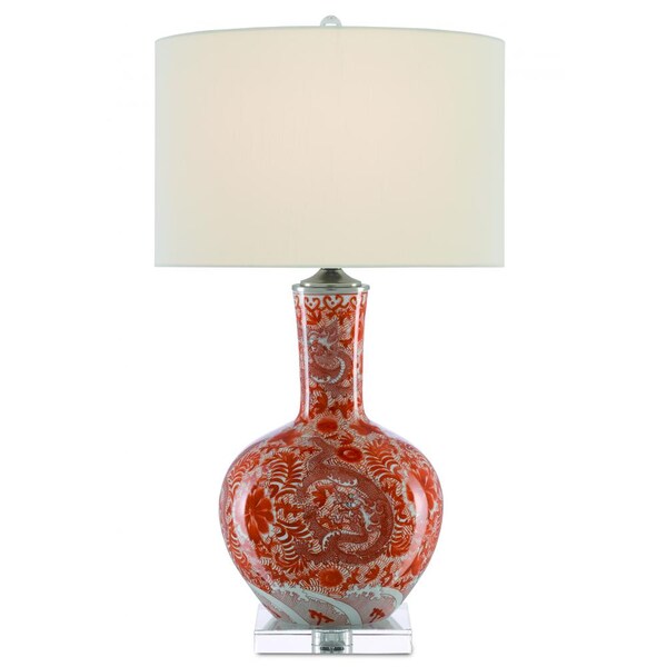 Ancient civilizations ornamented objects like our Sheng Red Table Lamp with dragons to portend the unknown. With its intricate dragon pattern in red and white, this porcelain lamp shows off the artistry of our talented finish artists. Sitting atop an optic crystal base, the red lamp is fitted with an eggshell shantung shade. We also offer the Sheng in a black table lamp.