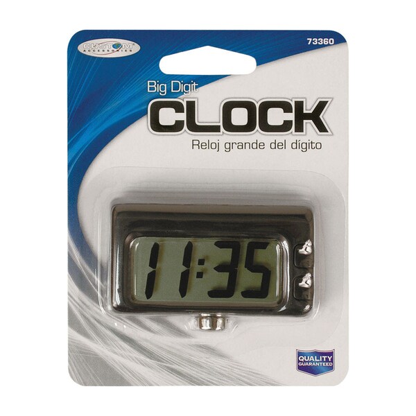 Add an easy to mount digital clock by custom accessories to your vehicle. This clock displays hours minutes and date. Large display design is easy to read. Mounts anywhere with hook and loop tape.