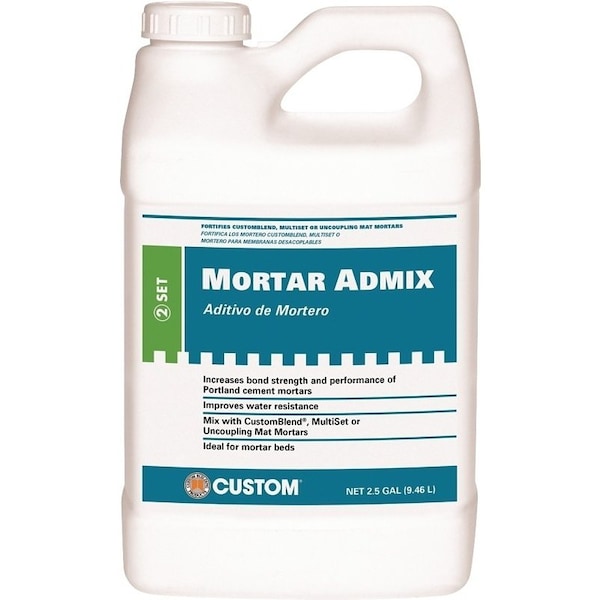 A liquid polymer designed to be used in place of water to increase performance of cement mortar beds, non-modified, thin-set mortars and cement-based grouts. It improves working characteristics and performance of cement-based mixes to boost water resistance, shock resistance and freeze-thaw capabilities for tile, stone or masonry installations. Increases performance of non-modified thin-set mortars for setting dense tile and setting over hard-to-bond surfaces. This Admix can be used with non-modified, thin-set mortars such as Custom Blend thinset mortar, coupling mat mortar as well as with Saltillo grout mix.