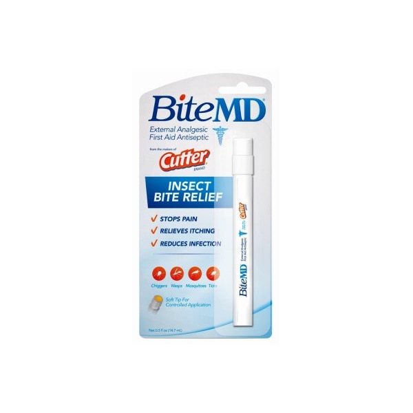 Cutter BiteMD Insect Bite Relief Stick s an external analgesic and first aid antiseptic pen that provides fast and effective relief from insect bites and stings. When applied soon after an insect bite, this product begins to work immediately to counteract the effects of bites and stings from bees, wasps, mosquitoes, ticks, hornets, ants, fire ants, deerflies, chiggers, sand fleas and horseflies. Use as first aid for temporary relief from pain, itching and infection related to insect bites. The Cutter BiteMD Insect Bite Relief Stick applicator features a soft tip for controlled application.