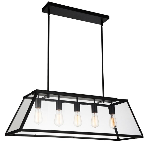 The Alyson 5 Light Chandelier clearly exudes that rustic warmth and industrial simplicity. This down chandelier has a 36 inch long glass and metal shade holding five exposed bulbs. This oversized light fixture can certainly cozy up a cottage-style kitchen or a rustic industrial dining room.