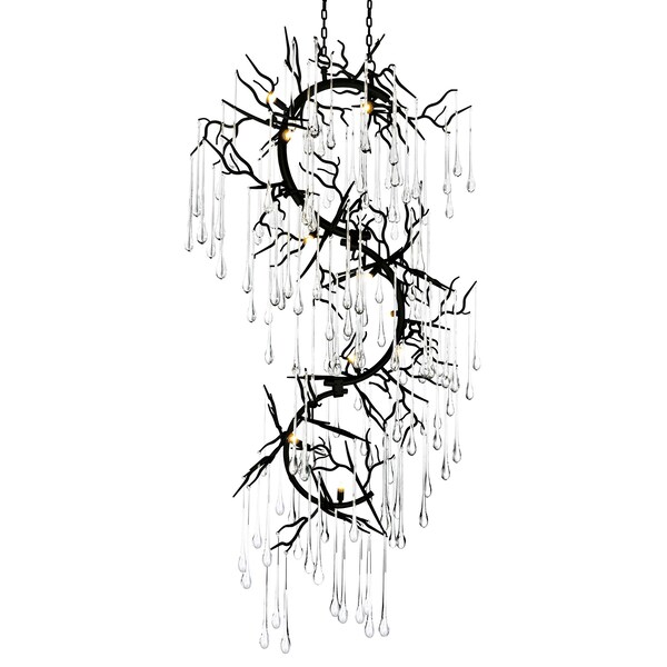 The Anita 12 Light Chandelier in black is flamboyant in every sense of the word. It displays a fascinating look with its curved tree branch-like frame that drips with clear crystal drops. The sculptural pendant measures 60 inches tall and is held by adjustable black chains. Hang this in your stairwell and give a whole new character to your interiors.