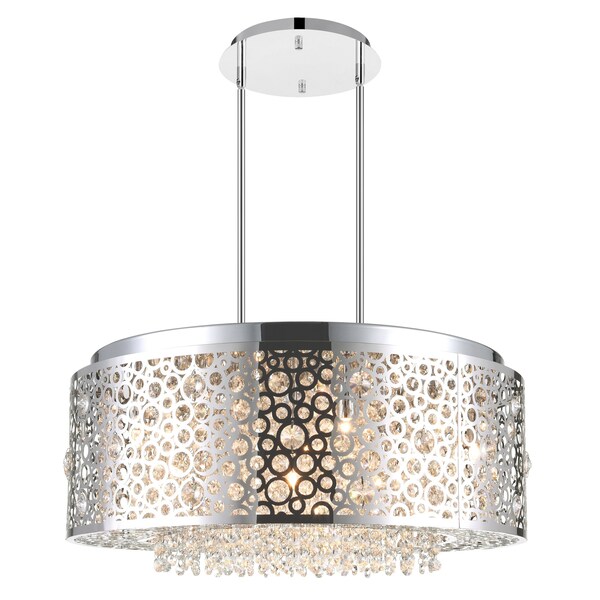 Make your modern space look and feel a little more exciting with this large drum shade chandelier. Exuding a bubbly personality, the Bubbles 9 Light Chandelier features bubble-like laser cuts on its round metal drum shade. From the inside drips strands of tiny round crystal beads that refracts light and cast an elegant twinkle to your space.