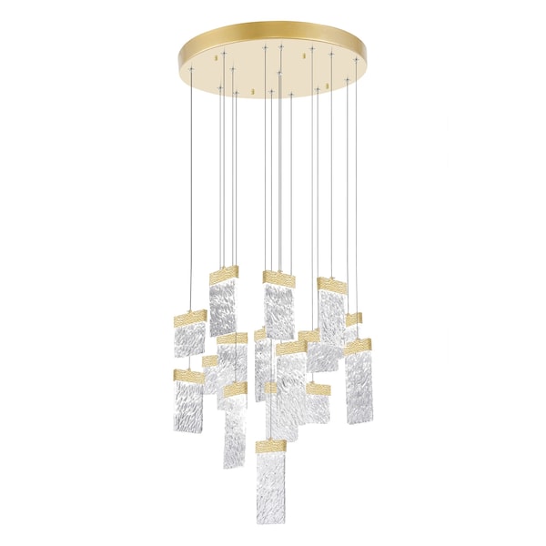 Liven up your whole space with the extraordinary glow of Carolina Gold Leaf 32 inch LED Chandelier. This light fixture features a round canopy in gold leaf finish holding textured glass panels with integrated LED. Each floating panel has an adjustable cord so you can adjust the height according to your preferred drop. Expect this stylish source of light to add a dash of drama on a tall ceiling and instantly amaze your guests.